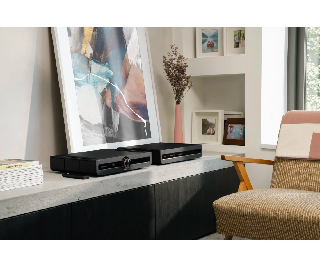 Il DAC Rapture dual-mono bilanciato gestisce gli ingressi digitali fino a 24-bit/192kHz sui coassiali e su HDMI eARC. La sezione preamplificatrice raggiunge THD+N inferiore allo 0,0008% con SNR superiore a 108dB — lo stesso standard del Caspian 4G Streaming Pre-Amplifier separato. Lo stadio phono MM con impedenza di ingresso 47kΩ/100pF e gain selezionabile gestisce qualsiasi testina a magnete mobile, con la stessa cura applicata al resto del circuito.