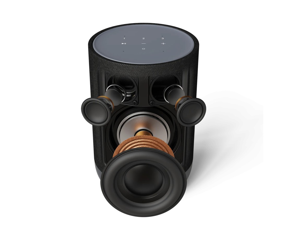 Il Denon Home 200 non è uno smart speaker da grande distribuzione. È un diffusore ingegneristico che porta nella forma compatta di un cilindro di 216 mm i medesimi principi acustici che guidano la progettazione dei prodotti hi-fi Denon da oltre un secolo. Il cabinet ospita tre amplificatori in Classe D dedicati a ciascuno dei tre driver: due tweeter da 25 mm e un woofer da 102 mm (4"). La separazione degli amplificatori elimina le interferenze tra canali e permette a ogni driver di operare nel proprio punto di lavoro ideale.