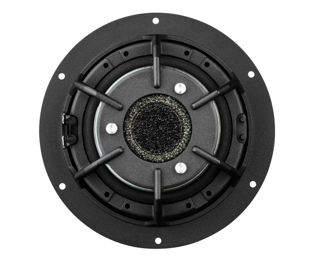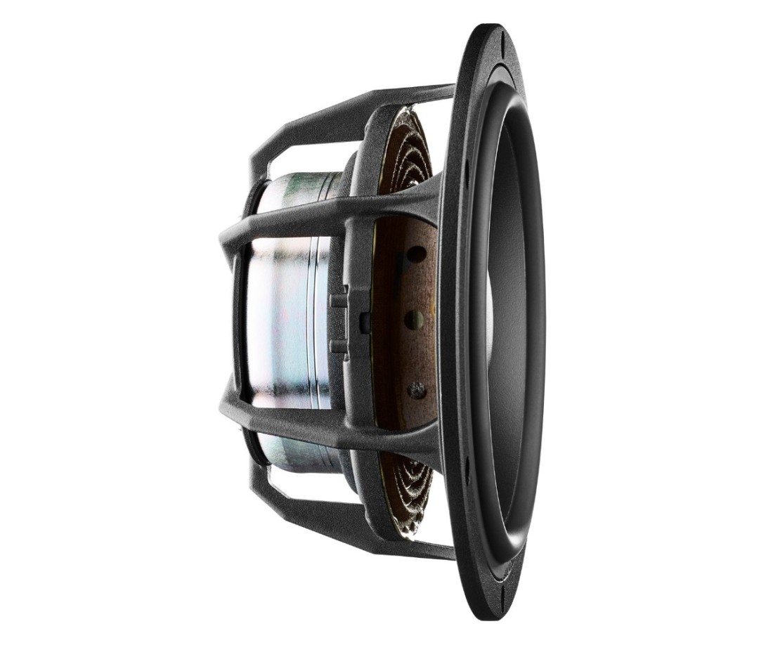 Il cono stesso utilizza un'escursione simmetrica accuratamente sviluppata per prestazioni di gamma media ancora migliori. Dietro è presente il ragno asimmetrico, un raddrizzatore armonico passivo. Riduce al minimo le armoniche superiori per migliorare ulteriormente la performance e rendere possibile non solo individuare le singole parti di un brano musicale, ma anche i singoli strumenti di un'orchestra. (Quindi ora, finalmente, la sezione del Terzo Violino può avere la sua giornata di sole.) E, come tutti gli altri coni MSP, è un design monopezzo (lo si riconosce dalle speciali nervature di bilanciamento attorno al parapolvere centrale) . Ciò gli conferisce una connessione incredibilmente solida con la bobina mobile, oltre a stabilizzarne la forma, il che è fondamentale quando si decide di alzare il volume.