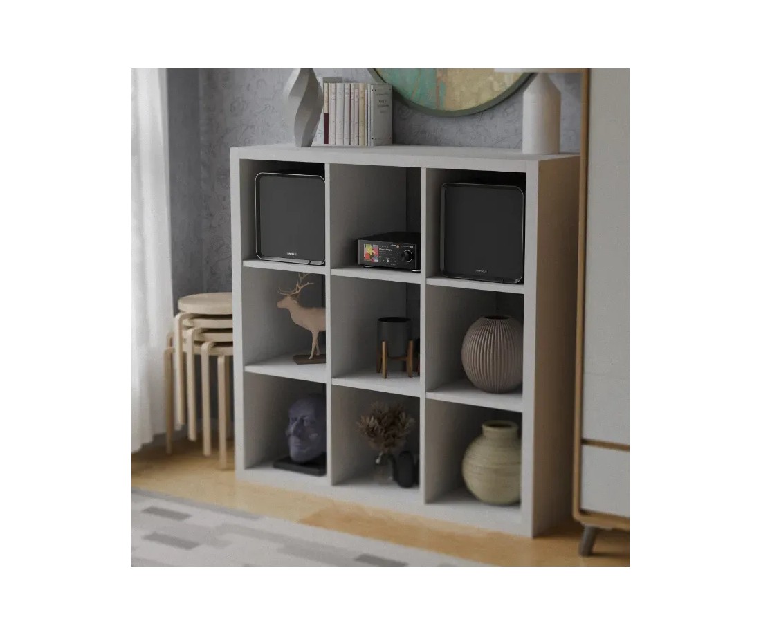 Questa logica modulare porta a un vantaggio pratico concreto: le dimensioni sono calibrate per inserirsi perfettamente negli scomparti delle librerie IKEA KALLAX, consentendo di costruire un impianto hi-fi integrato nell'arredamento senza scaffali dedicati o basi aggiuntive. Un dettaglio che trasforma radicalmente il modo in cui un sistema audio può vivere in una stanza.