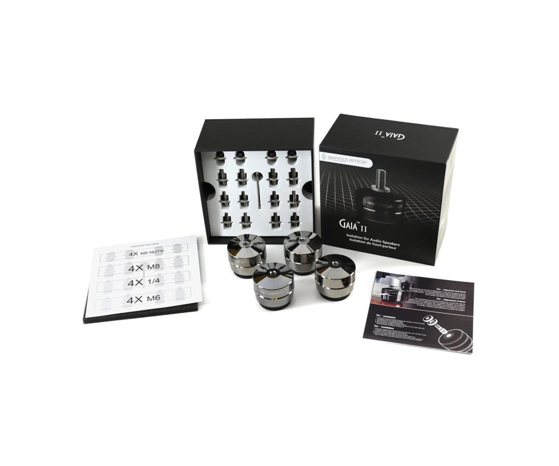 I GAIA sono filettati nella base dell'altoparlante o del subwoofer per sostituire le punte o i piedini esistenti. L'inserimento dei GAIA nella base dell'altoparlante crea una forte connessione con l'altoparlante. Con la parte superiore dell'alloggiamento GAIA collegata all'altoparlante e la parte inferiore di GAIA collegata alla superficie di supporto, tutta l'energia viene quindi gestita dall'isolatore interno di GAIA. GAIA I include adattatori filettati per le misure M8-1.25, M12-1.25 e ¼”-20.