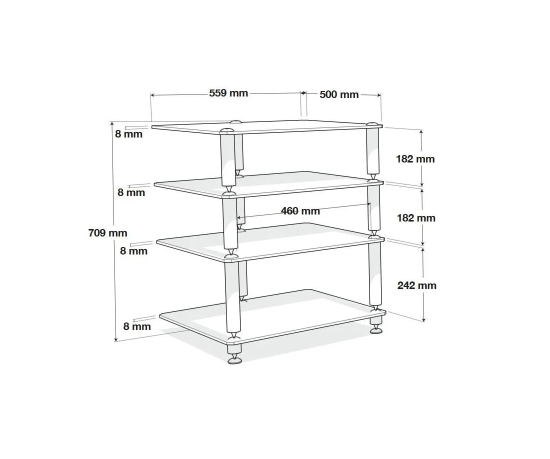 Il Bergen 2 offre quattro livelli di appoggio in vetro temperato nero da 8 mm, distribuiti su tre altezze nette differenti. La configurazione di fabbrica prevede due livelli da 182 mm utili per le elettroniche standard e un livello inferiore da 242 mm per le apparecchiature più alte — ma qui entra in gioco la vera intelligenza del Bergen 2.