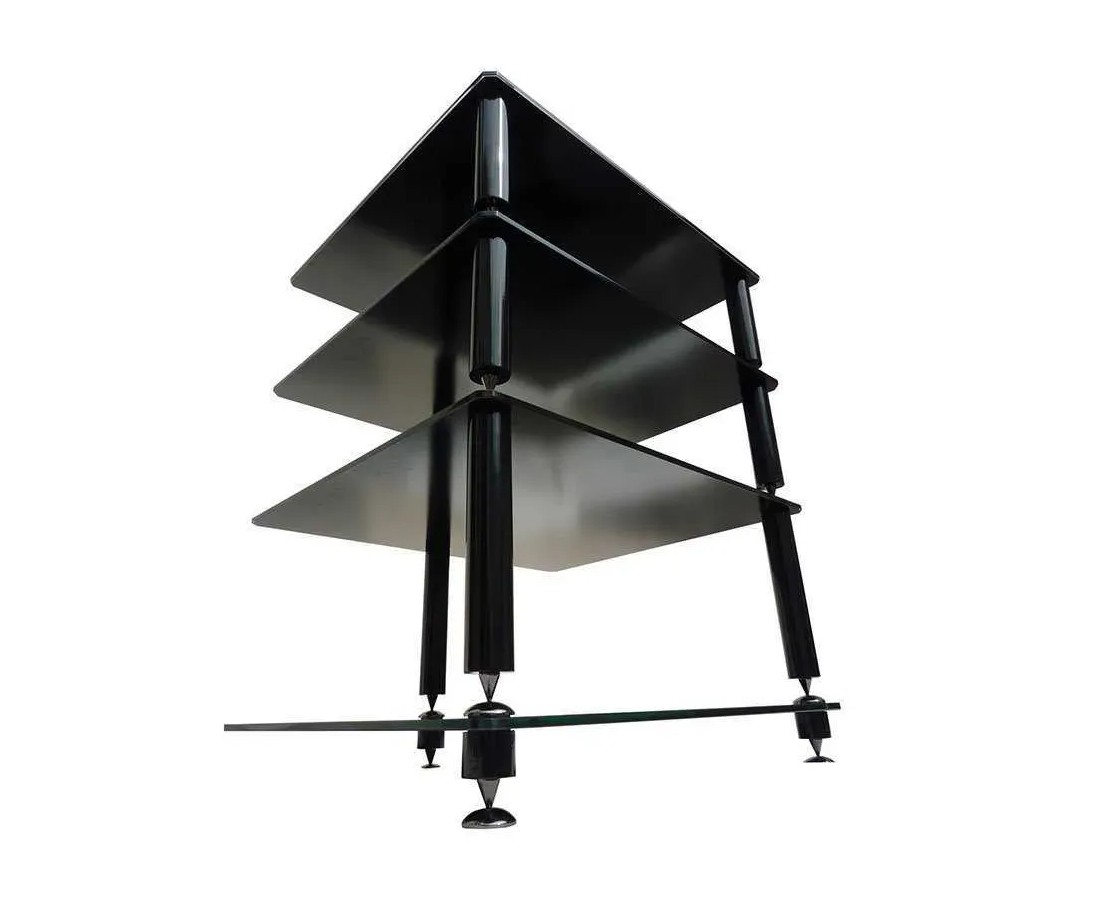 Ogni ripiano poggia sulle gambe tramite punte coniche in metallo con contropunte di appoggio. Il contatto puntiforme riduce la superficie di trasmissione delle vibrazioni, dissipandole nel punto di giunzione invece di propagarle al vetro.