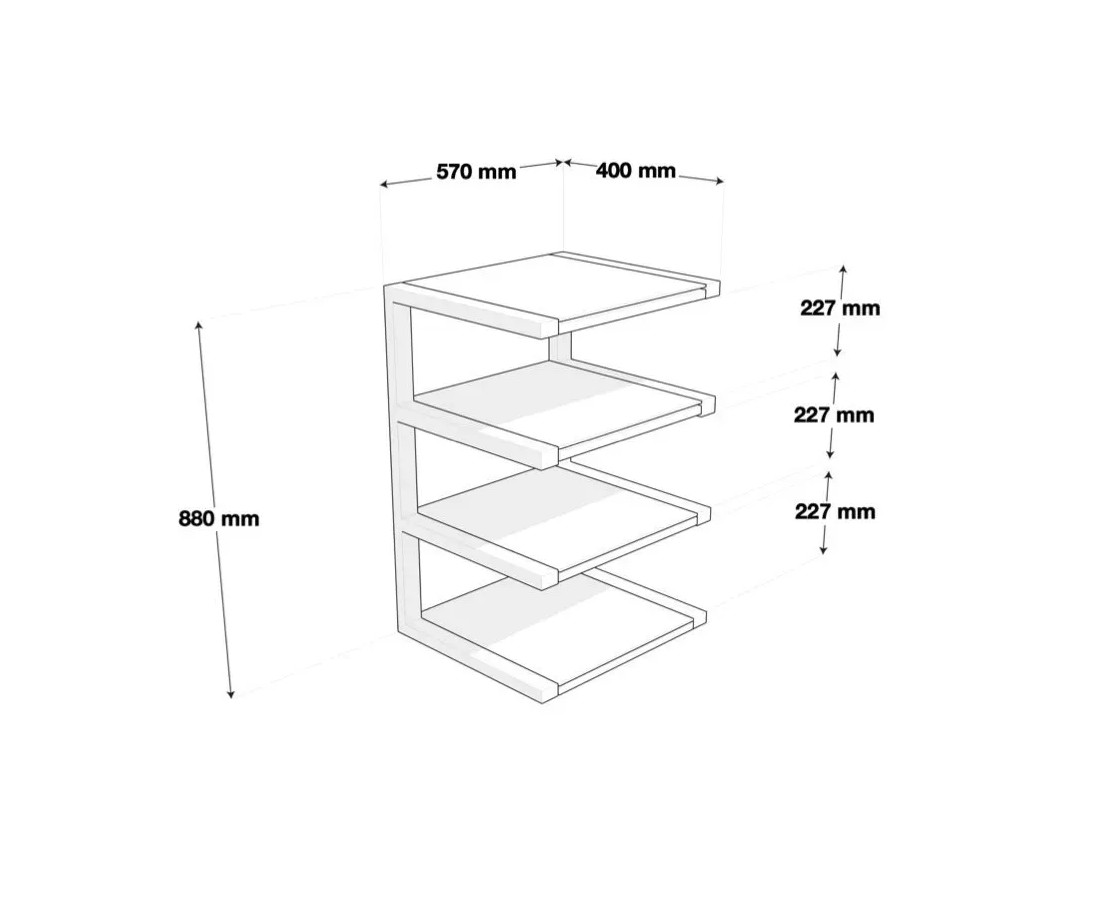 Con quattro ripiani a 227 mm e una larghezza generosa di 570 mm, l'Esse HiFi è dimensionato per ospitare un sistema Hi-Fi completo senza sacrificare nulla — sorgente analogica, amplificazione, sorgente digitale e, se necessario, un preamplificatore phono esterno.