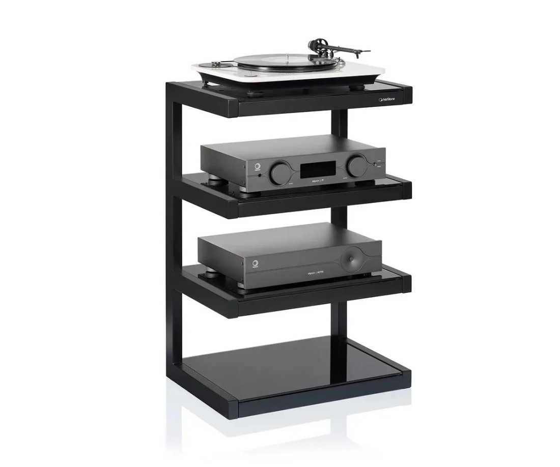 Chi possiede già una mensola Esse WS a parete per il giradischi può usare l'Esse HiFi esclusivamente per le elettroniche, sfruttando tutti e quattro i ripiani per amplificatore, DAC, preamplificatore phono e streamer — uno stack visivamente ordinato, nella stessa famiglia stilistica, con il giradischi a parete come focus della zona ascolto.