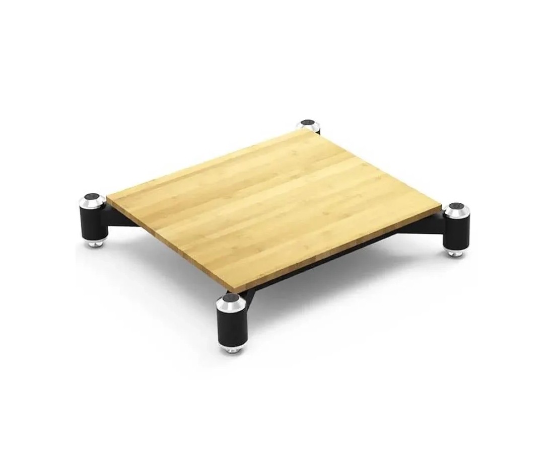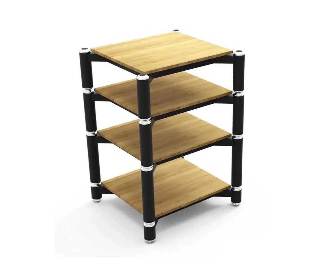 La finitura bamboo non è solo una scelta estetica. Il bamboo — tecnicamente una graminacea, non un legno, ma con durezza comparabile alla quercia — ha una struttura fibrosa che assorbe le micro-vibrazioni per smorzamento interno invece di rifletterle. Un ripiano in bamboo ben assemblato si comporta acusticamente in modo più "morto" rispetto al vetro, che tende invece a risuonare se eccitato da frequenze prossime alla sua risonanza propria. Per le elettroniche più sensibili alle vibrazioni — stadi phono, DAC di alta qualità, amplificatori a valvole — la versione bamboo può offrire un vantaggio tecnico concreto oltre all'estetica.