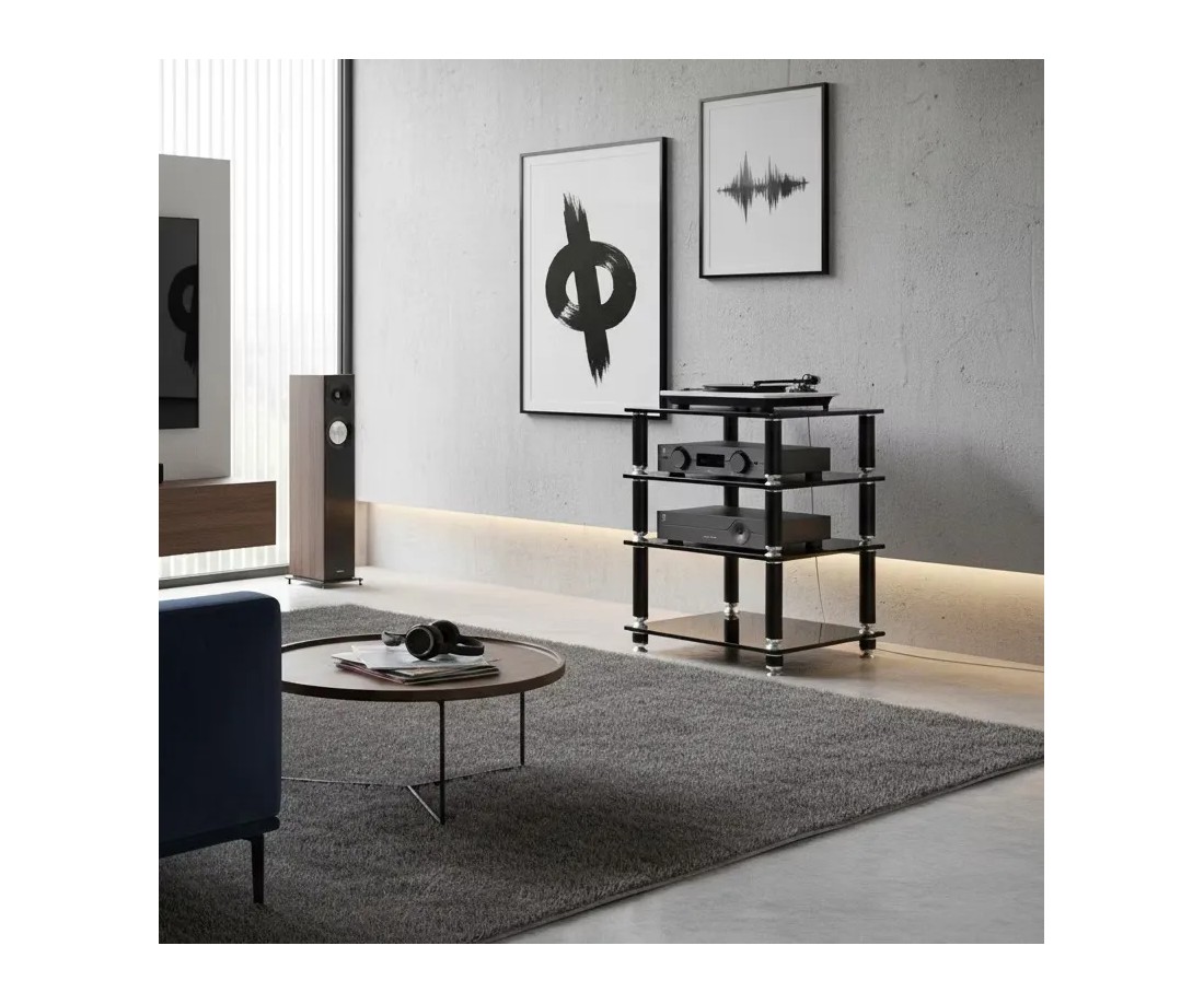Il Norstone Stabbl HiFi è il rack Hi-Fi più massiccio e tecnicamente avanzato della gamma Norstone. Vetro temperato da 15 mm di spessore — il doppio degli altri rack della linea — sistema di assorbimento d'onda integrato nei montanti, gambe riempibili con sabbia acustica, punte e contropunte su ogni livello. Cinquanta chilogrammi di carico per ripiano, duecento in totale. Cinquantadue chilogrammi di peso proprio. Unica finitura: nero assoluto, struttura in acciaio epossidico con dettagli in alluminio spazzolato.