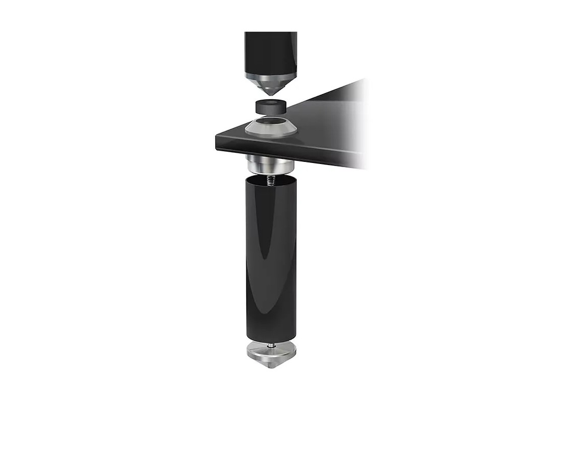 Le punte inferiori delle gambe poggiano su sottopunte in acciaio massiccio che isolano il mobile dal pavimento, proteggono la superficie da graffi e completano la catena di disaccoppiamento.