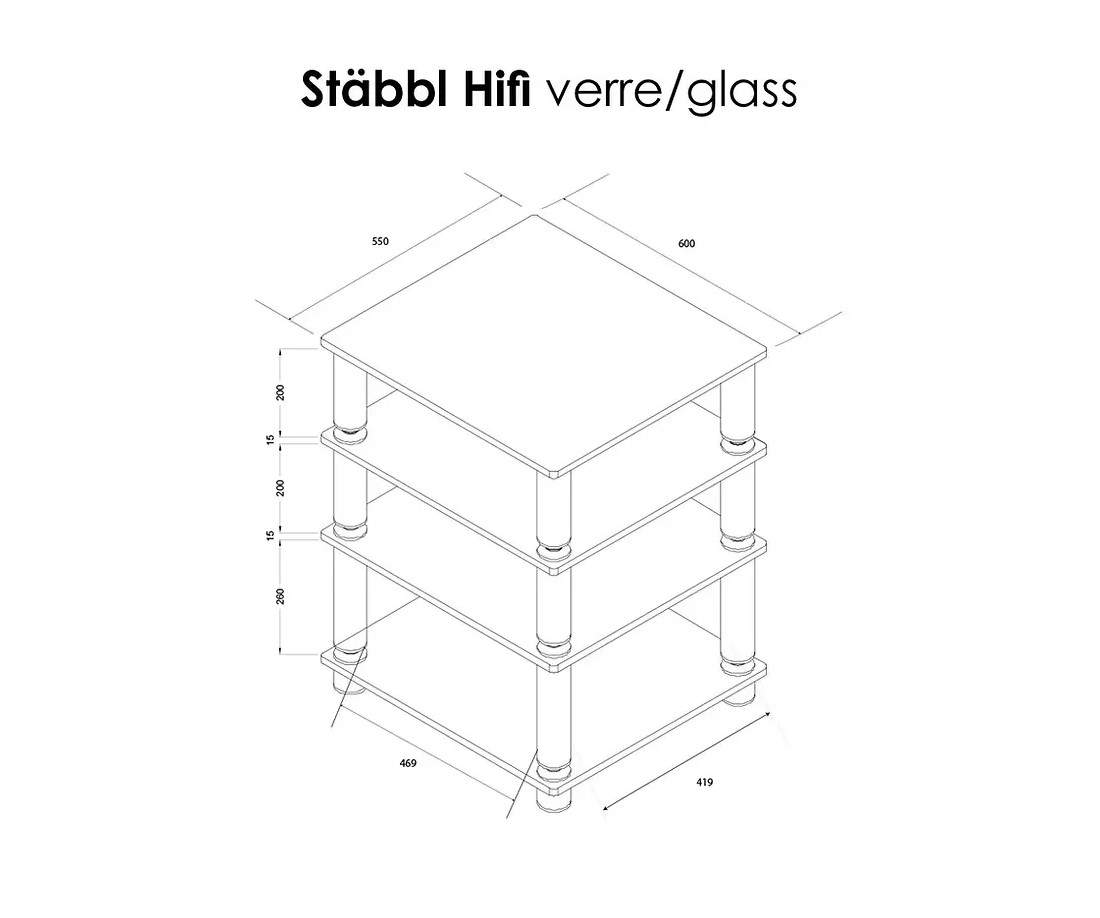 Il dato che distingue lo Stabbl HiFi da qualsiasi altro rack della gamma Norstone è lo spessore dei ripiani in vetro temperato: 15 millimetri. Per confronto, l'Esse HiFi usa vetro da 6 mm, l'Epur 4 da 8 mm. Lo Stabbl è più del doppio — e non è solo una questione estetica.