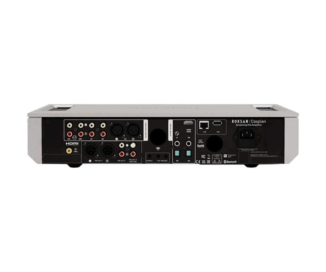 Roksan Caspian 4G - Preamplificatore streaming della serie Caspian 4G. BluOS multi-room 24-bit/192kHz, 64 zone. Roon Ready, AirPlay 2, Spotify/TIDAL Connect. DAC Rapture dual-mono. Ingressi: XLR, RCA, Phono MM/MC, 2× Coax, 2× Ottico, HDMI eARC, Ethernet Gigabit, Wi-Fi 5, USB-A. Uscite Pre-Out XLR bilanciate con gestione subwoofer via DSP. THD+N <0,0008%, SNR >108dB. App MaestroUnite, OTA. Dim: 93×432×378mm – 10,1 kg.