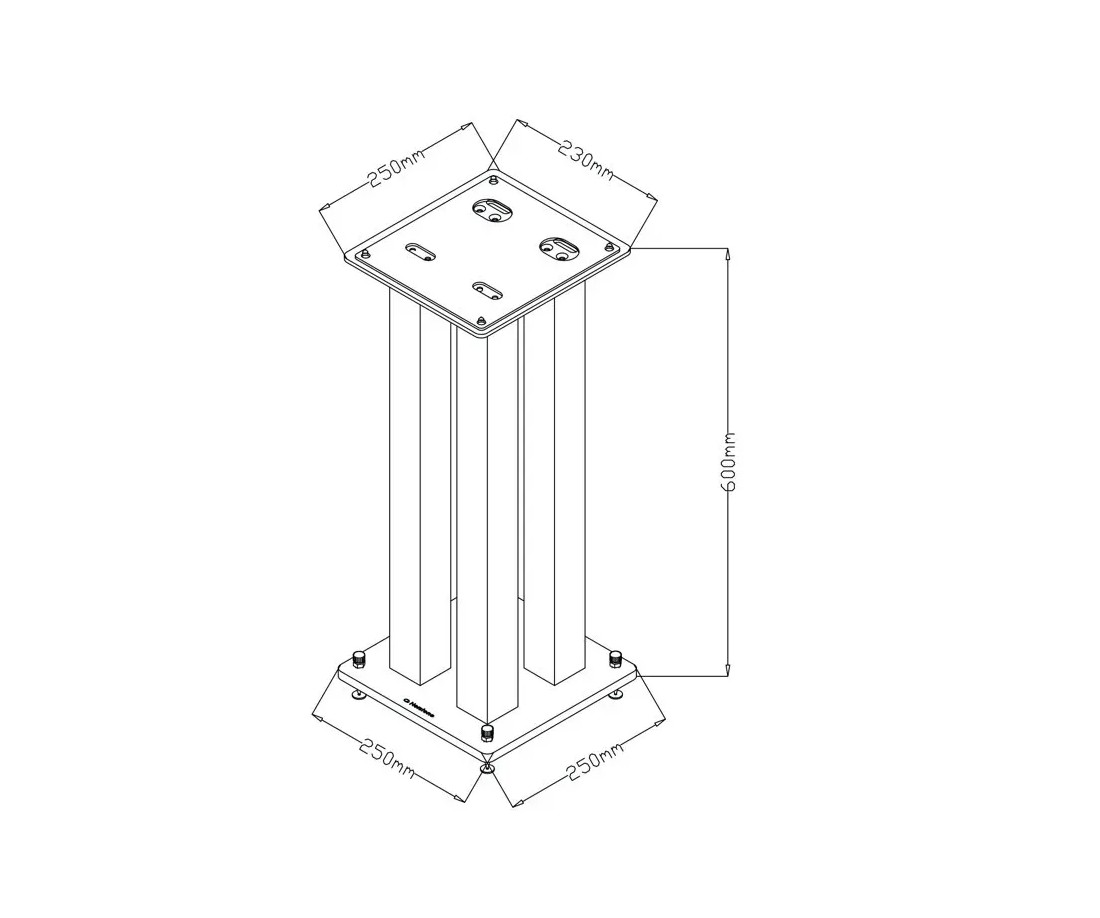 Lo Stylum Square prende un percorso completamente diverso rispetto al resto della famiglia Stylum. Dove gli altri modelli usano uno, due o tre pali circolari, lo Square schiera quattro colonne a sezione quadrata che formano un rettangolo attorno alle piastre superiore e inferiore: una geometria che ricorda i Foundation e gli stand hi-fi classici della tradizione anglosassone, rivisitata con le finiture satinate Norstone. L'aspetto è massiccio, simmetrico e volutamente dichiarato — niente di discreto o che “scompaia” in una stanza.