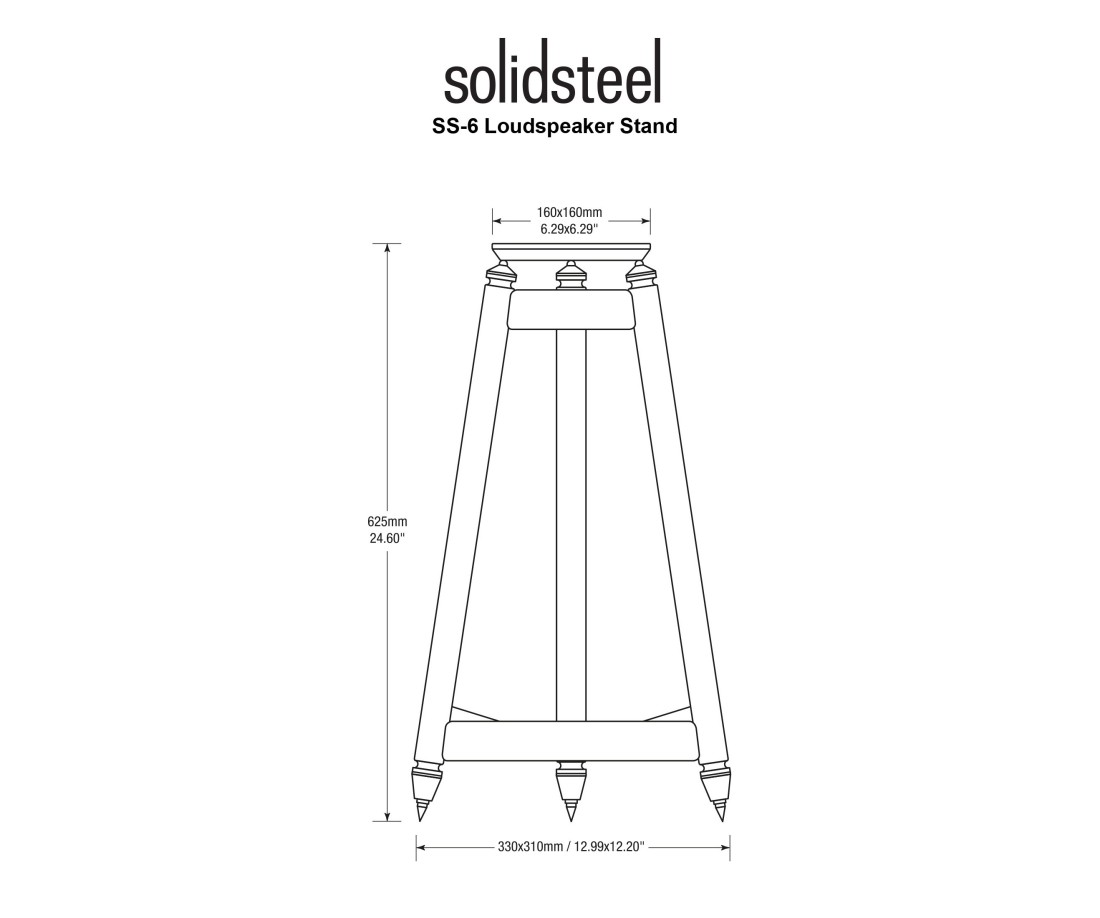 La serie Solidsteel SS soddisfa un'esigenza di vecchia data per quanto riguarda la corretta configurazione e il divertimento degli altoparlanti monitor e deve essere considerata per molti versi importante quanto le unità che supportano. I tre supporti tubolari terminano con una barra d'acciaio aggraffata. Le punte in acciaio inossidabile sono rimovibili per consentire il riempimento del telaio con materiale smorzante. La piastra superiore in MDF è intercambiabile, garantendo un alto grado di ottimizzazione con il maggior numero di altoparlanti.