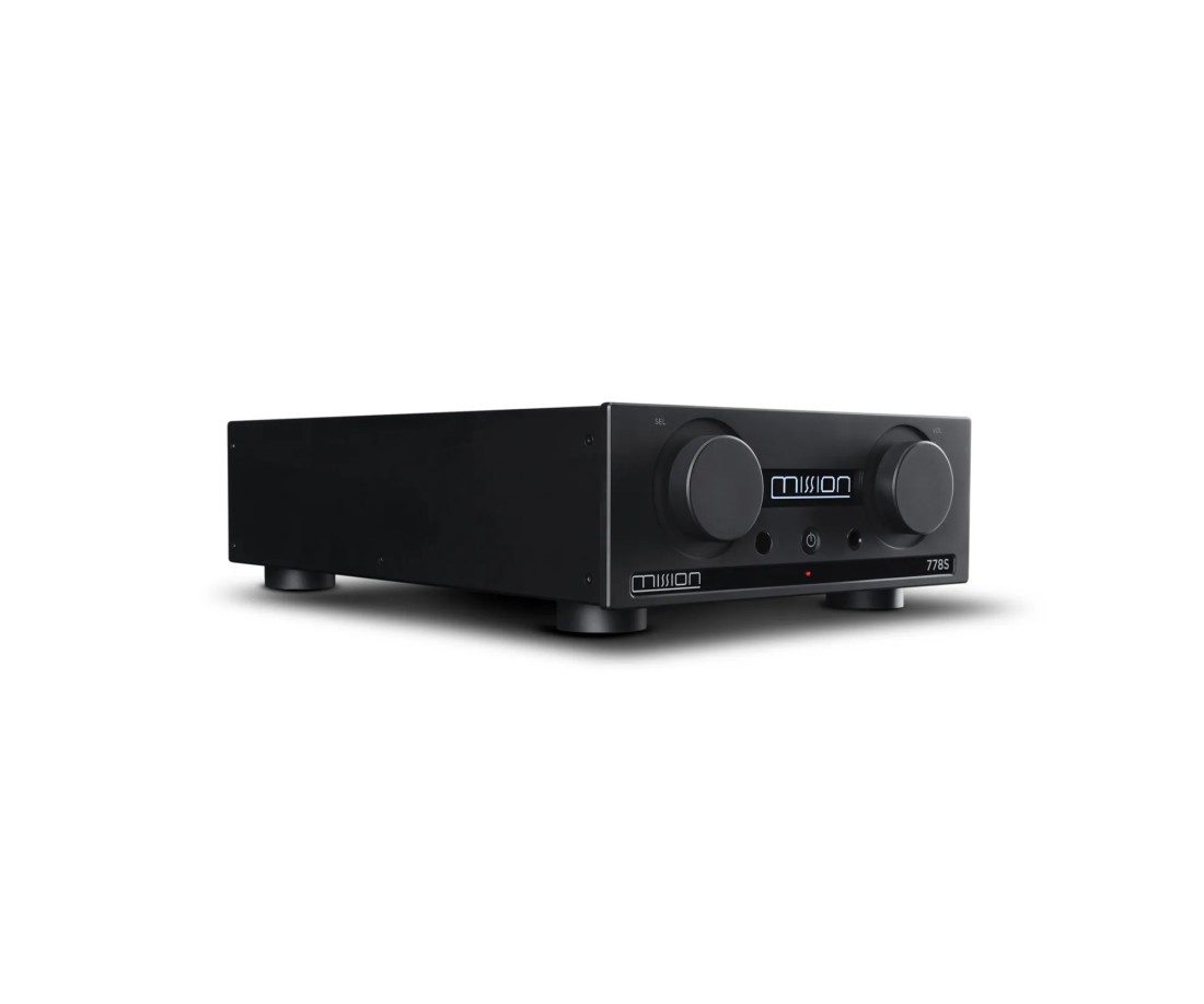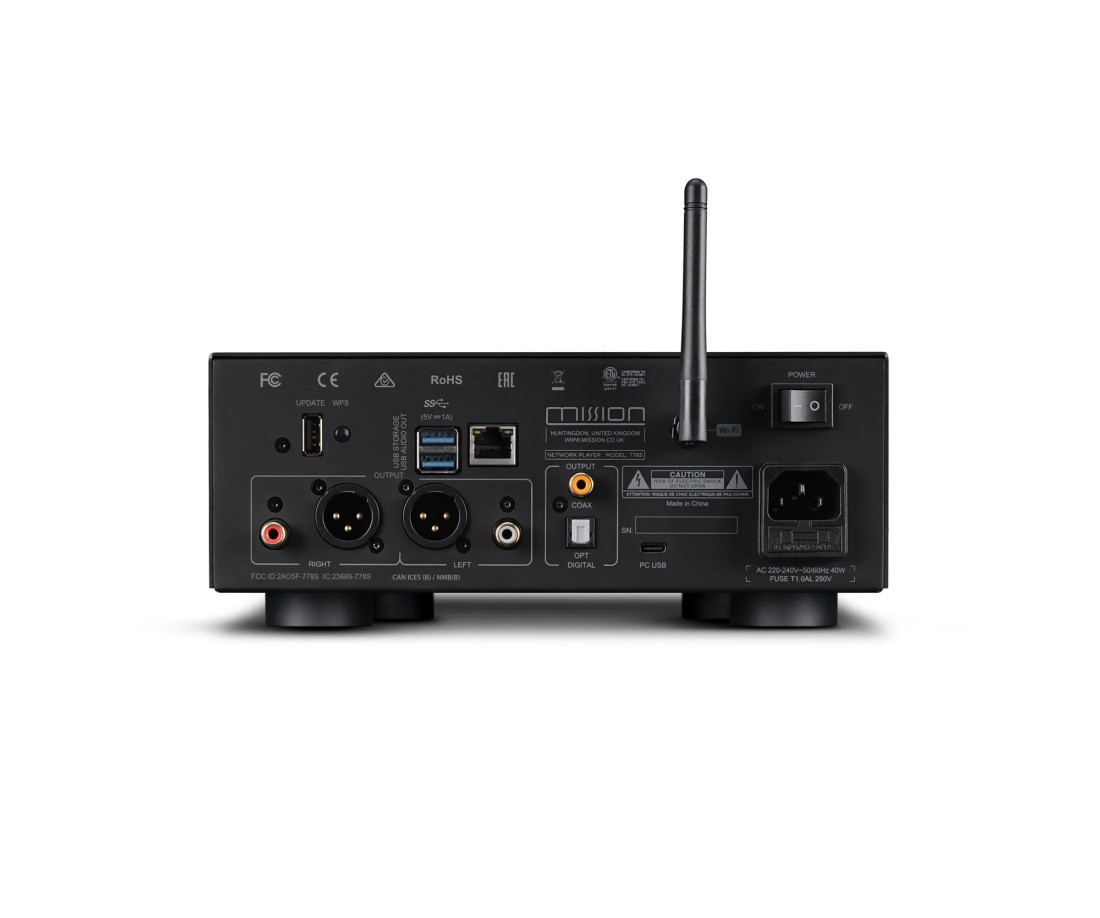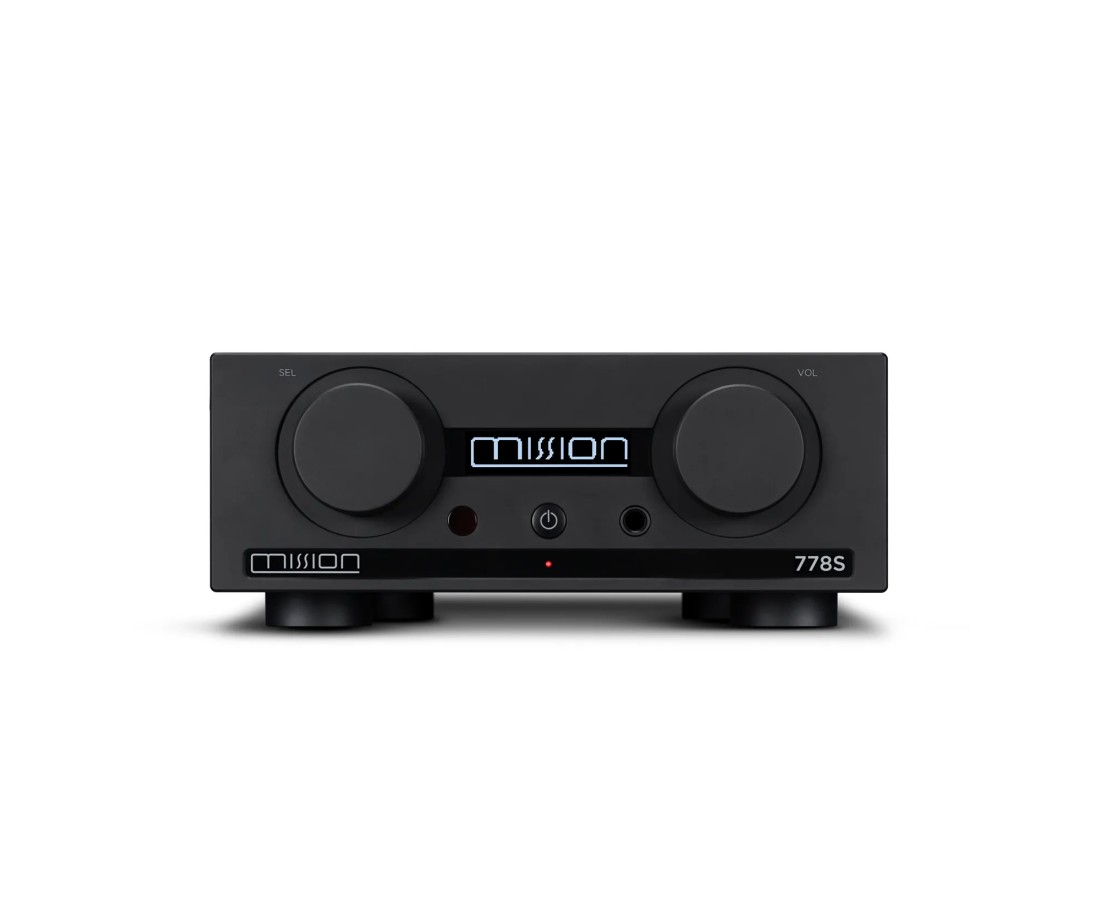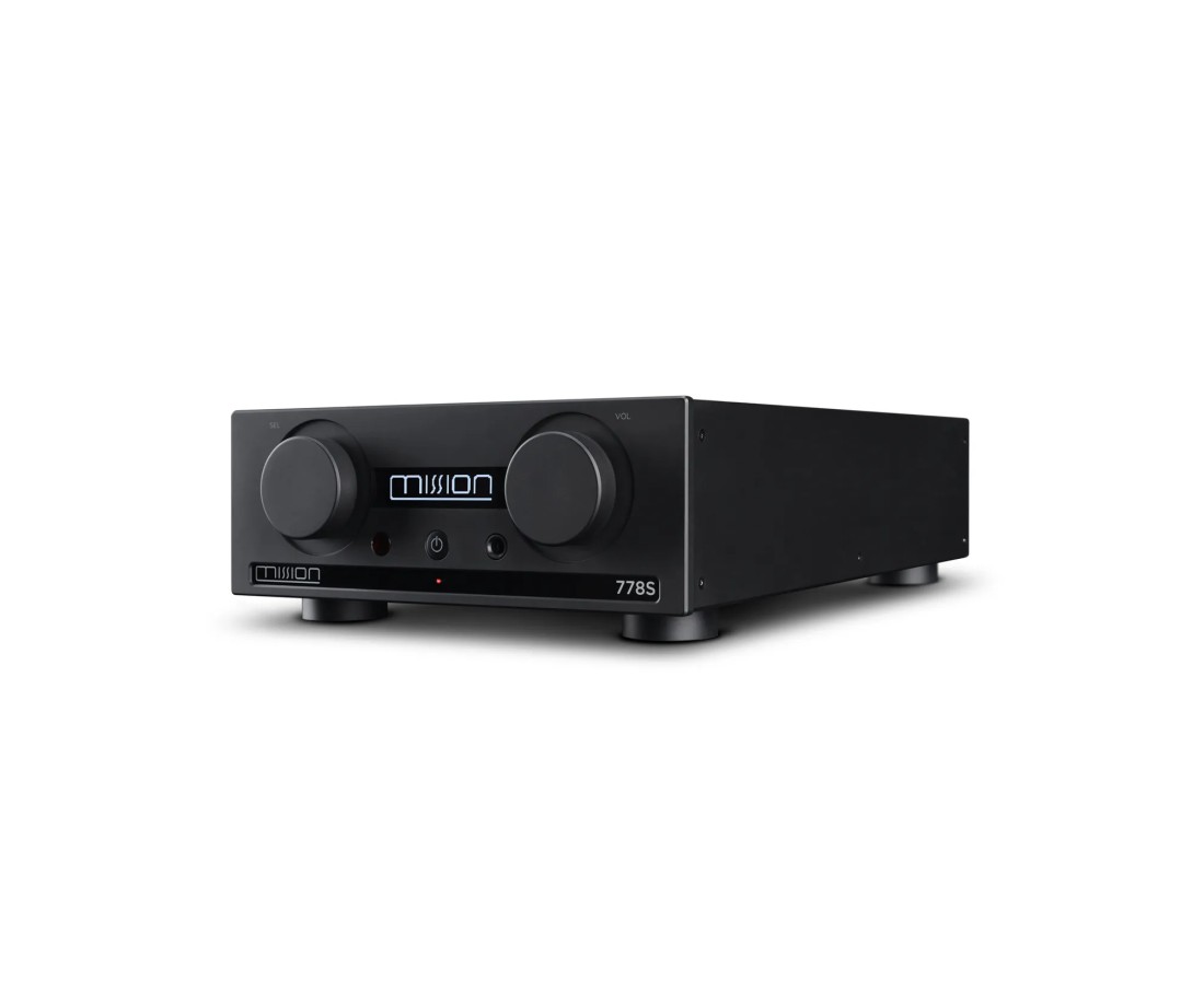 Mission 778S - Primo streamer di rete di Mission: piattaforma Silent Angel con CPU ARM Cortex-A72/A53 multi-core, DAC ESS ES9038Q2M SABRE32 32 bit con HyperStream e Time Domain Jitter Eliminator, upsampling a 352,8/384 kHz disattivabile, 5 filtri DAC selezionabili. Alimentazione toroidale con sezioni isolate, stadio post-DAC Classe A, amplificatore cuffie Current-Feedback. Uscite: XLR bilanciate, RCA, coassiale, ottico, USB-A. Ingressi: Wi-Fi dual-band, Ethernet Gigabit, USB-C (PC/Mac), 2× USB-A. Spotify Connect, TIDAL Connect, Qobuz Connect, AirPlay 2, Roon Ready, DLNA/UPnP. PCM 768 kHz / DSD512. Display OLED dimmerabile. Half-width. Dimensioni 236×98×357 mm, 5,3 kg. Nero o Argento.
